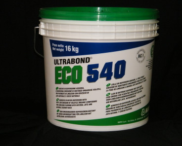 Adhesive in water dispersion with low emission of volatile organic compounds (VOC) specifically formulated for installing linoleum flooring.